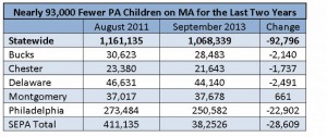 HAP reports that “the number of Pennsylvanians covered by private, employer-based plans hit an all-time low of 59.5 percent in 2012.” Meanwhile, from August 2011 to September 2013, there was a net reduction of 93,000 Pennsylvania children from Medical Assistance. Almost 29,000 of them from southeastern PA.