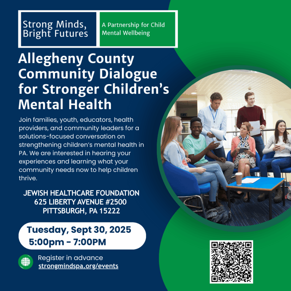 Allegheny County Community Dialogue for Stronger Children’s Mental HealthAllegheny County Community Dialogue for Stronger Children’s Mental HealthSeptember 20, 2025 @ 5:00 pm- @ 7:00 pm at Jewish Healthcare Foundation by Strong Minds, Bright Futures CoalitionMore Info