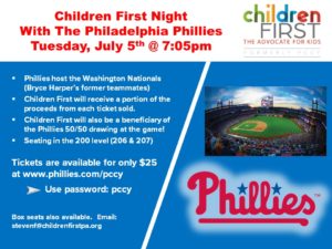 Join Children First at the Citizens Bank Park as we return to visit the Philadelphia Phillies as they take on the Washington Nationals. Tickets are $25 in the 200 level – first base side. Get your tickets now.