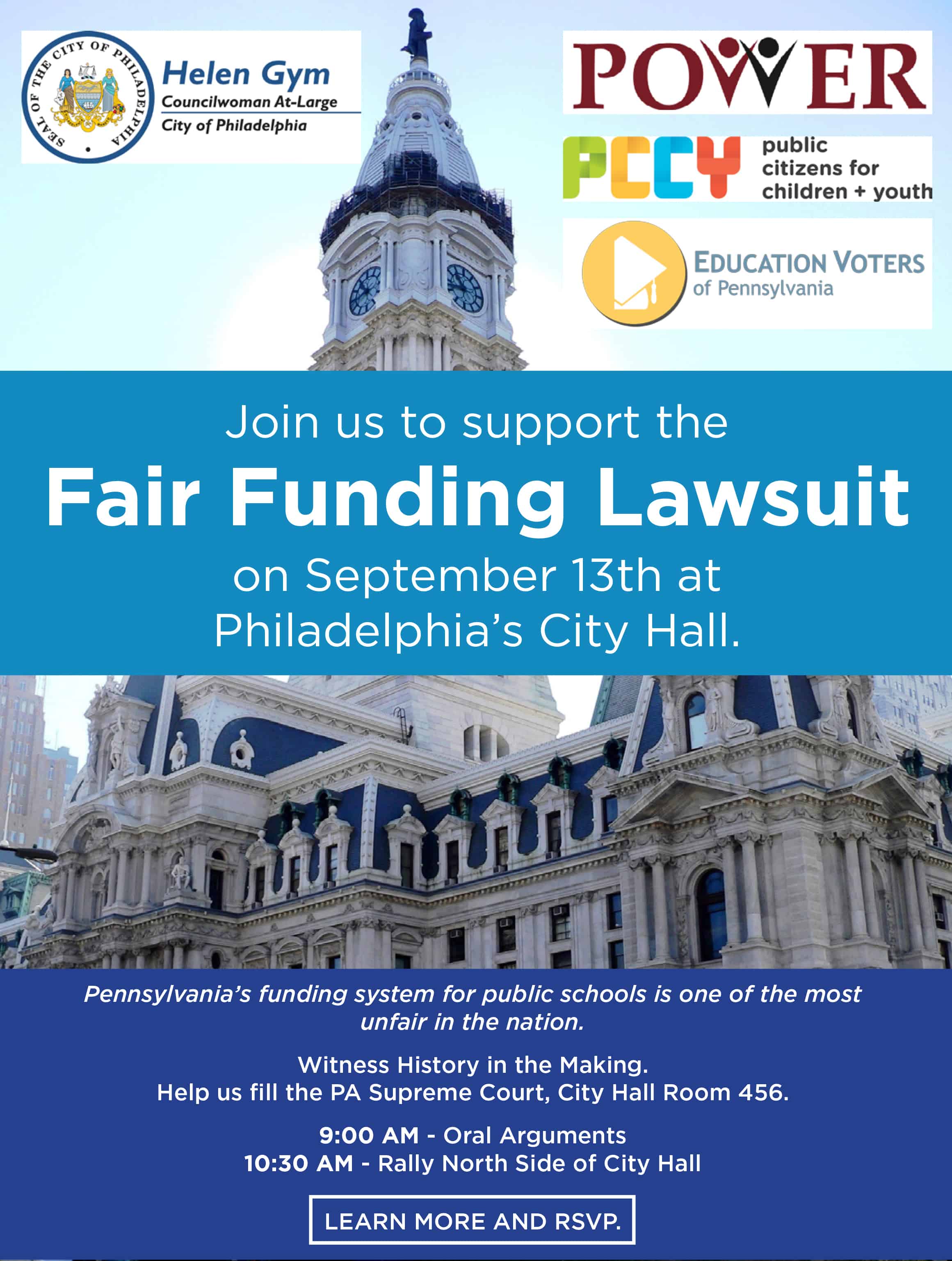 Philadelphia’s funding system for public schools is one of the most unfair in the nation. Join us to support the Fair Funding Lawsuit on September 13, 2016 at Philadelphia’s City Hall. Oral arguments start at 9am. There will be a really on the north side of City Hall at 10:30am. Click here to download a PDF of the flyer and share it!