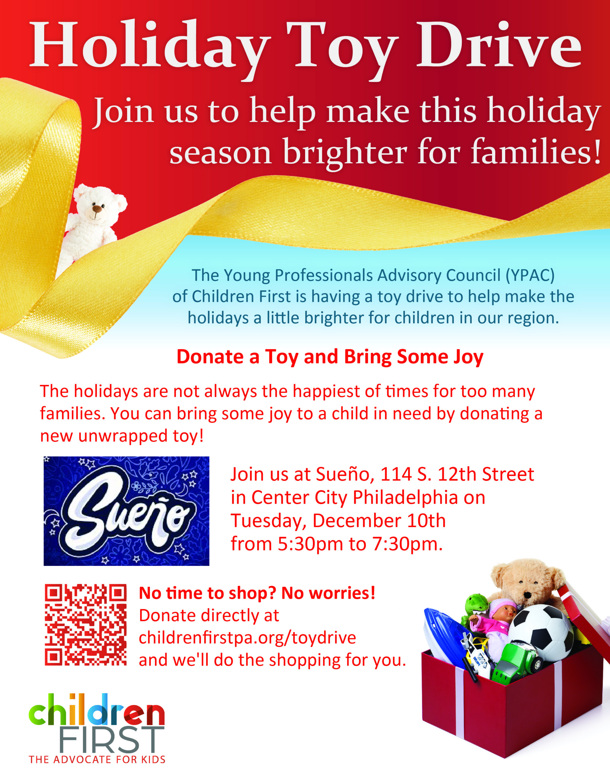 The Young Professionals Advisory Council of Children First is bringing back their toy drive for a fifth year in a row! Join us on Tuesday, December 10th from 5:30pm to 7:30pm at Sueno, 114 S. 12th Street in center city Philadelphia!
