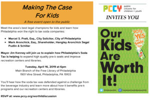 At this free event, on Tuesday, April 16th at 6pm at the Main Library, you’ll meet the area’s best legal champions for kids and learn how Philadelphia won the right to tax soda companies. Guest speakers include: