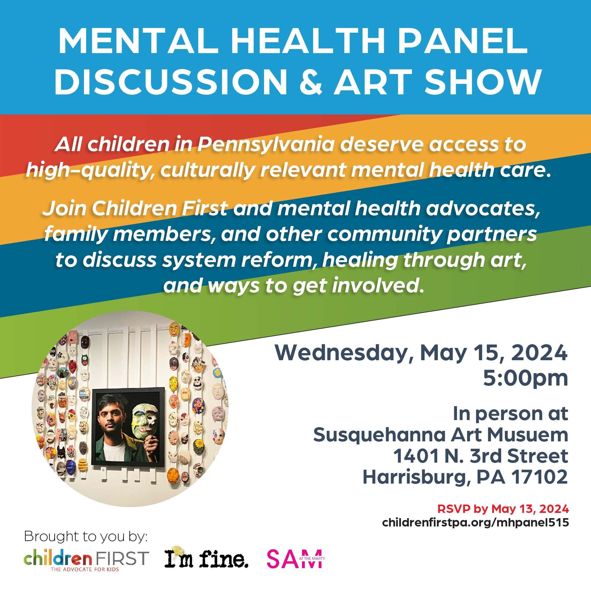 The rally will include speeches from mental health leaders such as Representative Mike Schlossberg and former Deputy Secretary Joan Erney. The rally will convene on the steps of the Capitol building at 1pm on Wednesday, May 15th. We are encouraging our partners and stakeholders to attend the rally, and Children First will be hosting a special event for advocates following the rally at the nearby Susquehanna Art Museum.