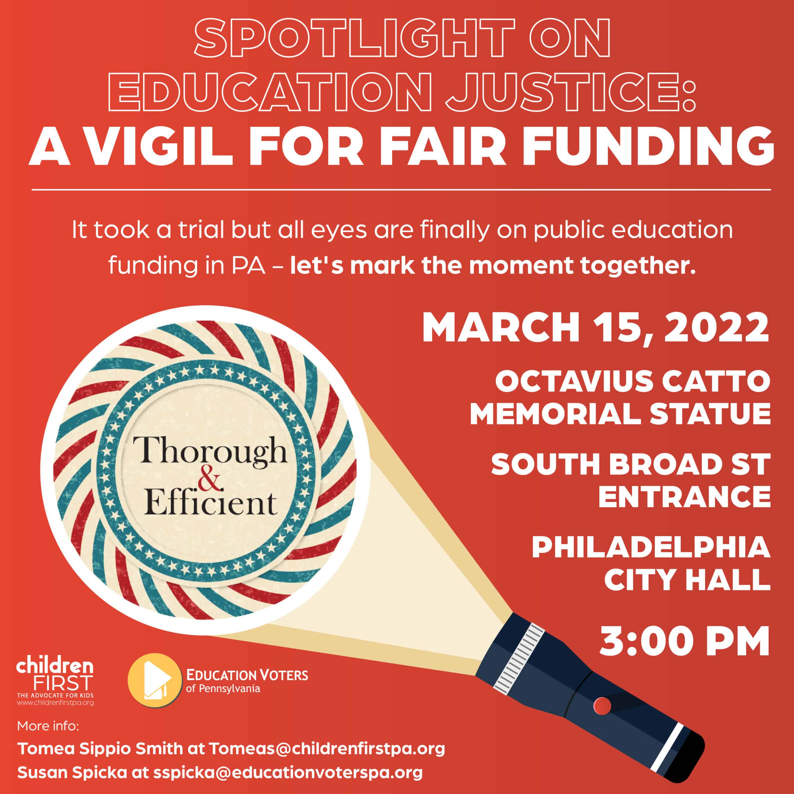 Join us for a Vigil for Fair Funding on March 15th at 3pm at Philadelphia’s City Hall by the Octavius Catto statue located on the South Broad Street side of the building.