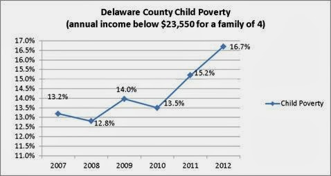 Despite the child population falling last year in Delaware County, there were almost 2,000 more children living in poverty with about 1,500 more living in deep poverty. The number of children in poverty in 2012 was 109% of the 2011 level, deep poverty at 117% of the 2011 level. To put that in perspective, the poverty line for a family of four is $23,550; a family of four in deep poverty sees less than $11,775 annually.