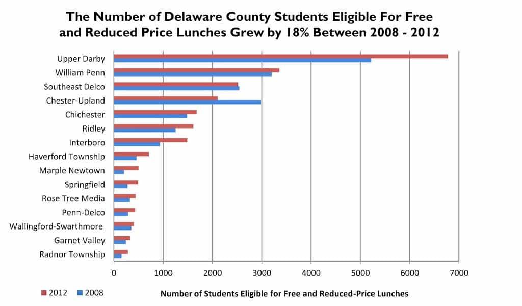 The number of students in Delaware County eligible for free and reduced-price lunch jumped 18% between 2008 and 2012. The impact has been felt particularly hard in Upper Darby, where a 30% increase since 2008 has resulted in nearly 6,800 qualifying students—almost 30% of all students eligible for free and reduced-price lunch in Delaware County. Unfortunately, Upper Darby wasn’t the only district in Delco having to deal with a major increase in economically disadvantaged students. In Marple-Newtown, the number of students eligible for free and reduced-price lunch more than doubled and in Springfield, the rate grew by nearly 80%.