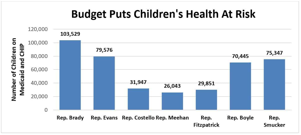 The budget also cuts funding for the Children’s Health Insurance Program by 20 percent. Today, more than 175,000 children get their health insurance through CHIP in Pennsylvania. While a majority of families receiving Medicaid insurance for their children are working, every family on CHIP is a working family and these families will no longer be able to stay afloat and ensure the health care needs of their children are adequately met.