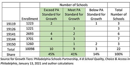 Second, the proposed school risks destabilizing established schools that are already demonstrating high academic growth. The applicant states that it will recruit students from five zip codes: 19119, 19126, 19141, 19144, and 19150. As shown below, 10,098 students attend 22 charter and traditional public schools in these neighborhoods. Adding new seats at a new school will inevitably reduce enrollment at existing public schools, destabilizing schools that are making progress.