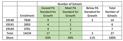 Pennsylvania’s PVAAS growth measures are reliable and validated indicators of improved school performance. PVAAS uses PSSA test results to gauge student academic growth and assess whether schools are making more progress than other schools in the commonwealth. As the table below shows, nearly nine out of ten schools (89%) in this applicant’s recruitment zone are at or above the norm for the state. This means students in these schools are progressing at or more than would be expected based on statewide trends. Authorizing new schools at the expense of schools that are already making progress does not support the goal of enabling students to meet academic standards.