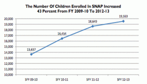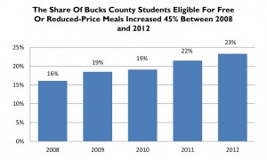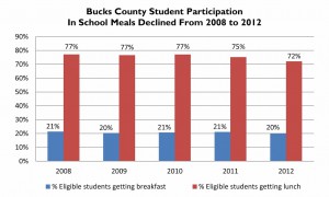 Less than a quarter of Bucks County’s residents are children, but nearly 40% of its residents on Food Stamps (SNAP) are. This is due to a 20% rise in the share of children in low-income families since 2008, in turn leading to a 43% increase in children receiving Food Stamps from FY2009-10 to FY2012-13. With the 43% increase in children on Food Stamps, there was a corresponding 42% increase in students eligible for free and reduced-price school meals from 2008-12. That, in and of itself, is not surprising. It makes sense, since these are the same children we’re talking about. But eligibility does not equal access. Despite thousands more children needing free or reduced-price lunches, participation in the program actually fell 5% in the last five years. And only 20% of low-income students received school breakfast in 2012.