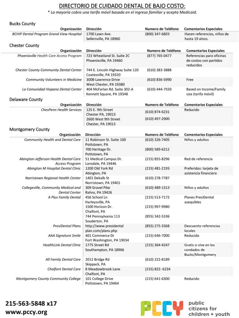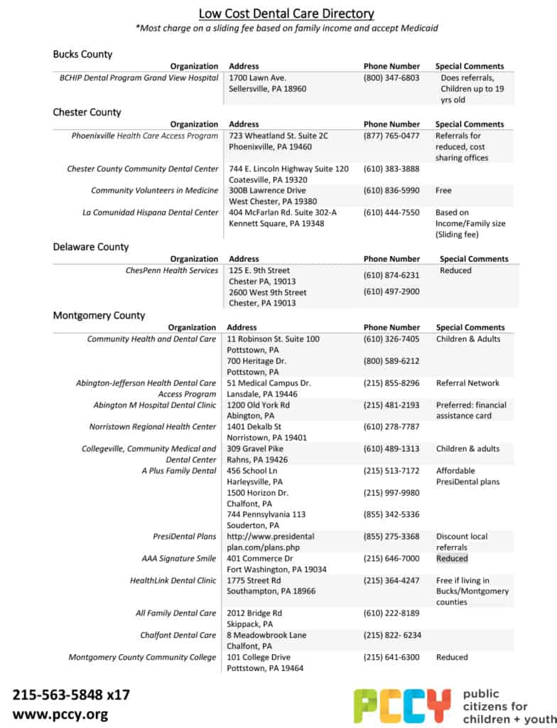 IF YOU DON’T HAVE A DENTIST OR INSURANCE: Find a dentist by using PCCY’s list of “Low-Cost Dental Care Providers in Southeast PA”
