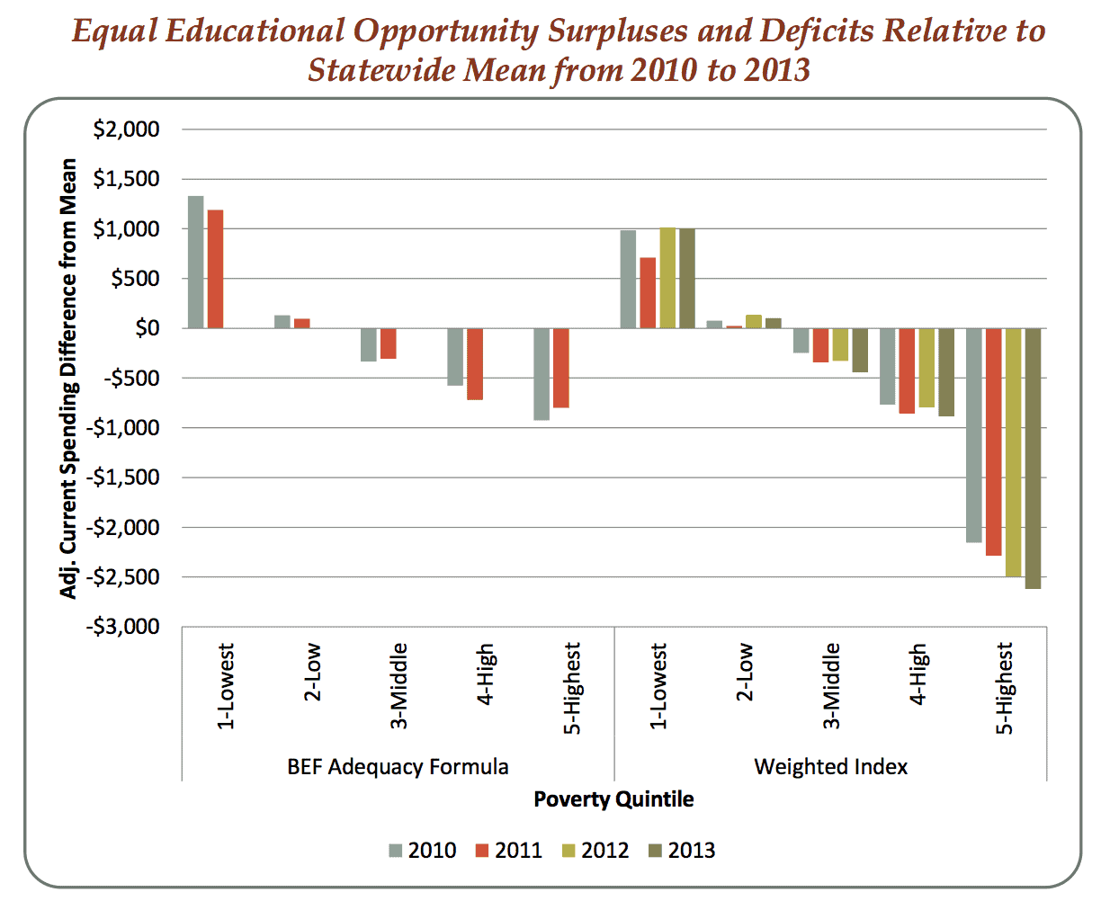 Pennsylvania certainly has high quality school districts—a new review gave it three of the top ten in the nation, with two of the top five in the Philadelphia area. Unsurprisingly, those two (Tredyffrin/Easttown and Lower Merion) are among the richest school districts in Pennsylvania, if not the country. It is too bad that most Pennsylvania students, unlike those in Tredyffrin/Easttown and Lower Merion, do not come from households with six figure incomes. In 2010, the study found that per student revenue was $2,000 higher in PA’s richer districts than its poorer districts. By 2013, that difference was $3,000. If you wanted to know what happens when a state dumps its funding formula, that is it. Per student spending increases in the richest districts vastly outpaced the other 80% of districts. According to the American Institute for Research, districts in the richest 5% of Pennsylvania spent 60% more per student than those in the bottom 5% in 2013.