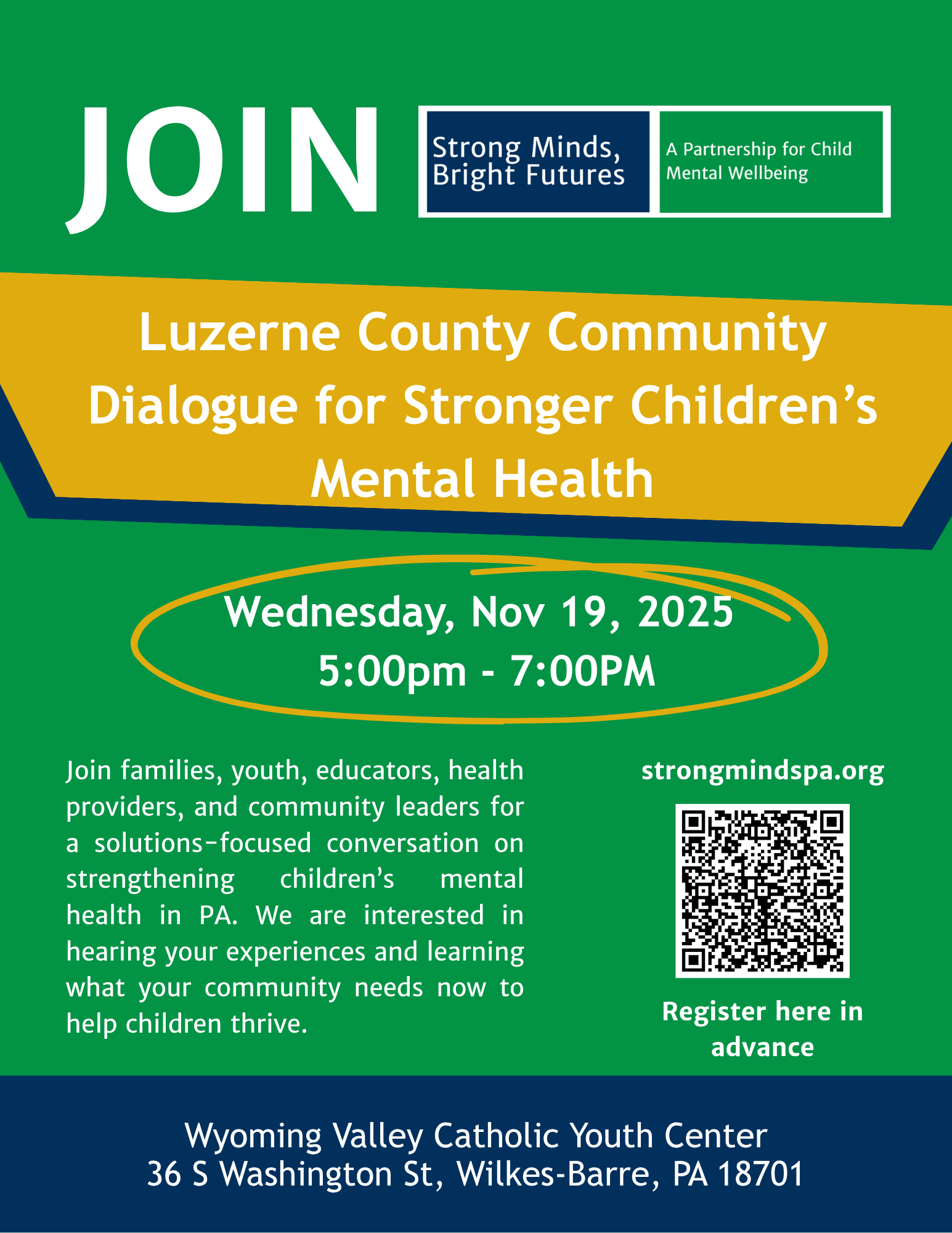 Join families, youth, educators, health providers, and community leaders for a solutions-focused conversation on strengthening children’s mental health in PA. We are interested in hearing your experiences and learning what your community needs now to help children thrive. This is a free, family friendly event.