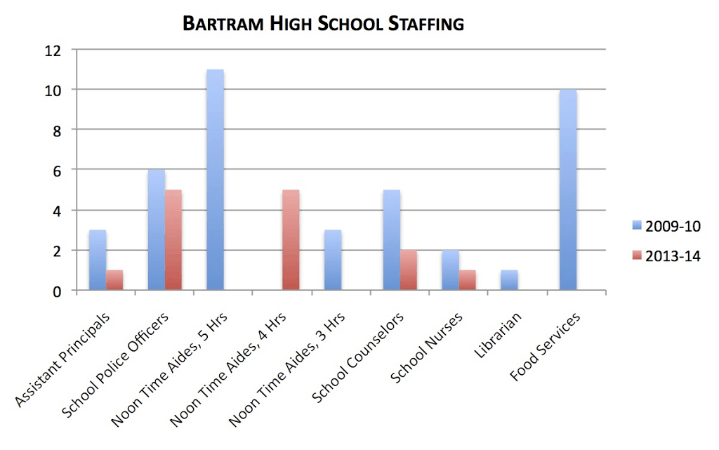Many of the cuts have hit the already stretched support and discipline staffers. PCCY’s analysis found that Bartram lost two of its three assistant principals, three of its five counselors, all four of its supportive services assistants, all three of its community relations and social services liaisons, its sole librarian, nearly all its bilingual counseling assistants, its at risk student support, one of its two school nurses, one of its six school police officers and its entire cafeteria staff. But the move that puts students and staff most at risk might be the drop in noon time aides—the people who keep order in the school, in the cafeteria and in the halls between classes—from 64 man-hours a day down to 20. That’s five people, working just four hours each, responsible for more than 1,000 students.